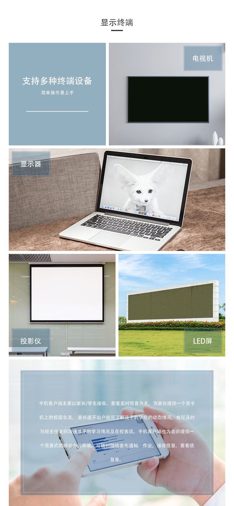 支持電視機(jī)、顯示器、投影儀、LED屏、手機(jī)端等多種顯示終端,簡(jiǎn)單操作易上手。手機(jī)客戶(hù)端主要以家長(zhǎng)/學(xué)生接收、查看實(shí)時(shí)信息為主,家長(zhǎng)逐不出戶(hù)就可了解孩子到學(xué)校的動(dòng)態(tài)情況,也可及時(shí)與班主任老師溝通孩子的學(xué)習(xí)情況及在校表現(xiàn)。手機(jī)客戶(hù)端也為老師提供一個(gè)簡(jiǎn)易式的移動(dòng)辦公環(huán)境,可隨時(shí)隨地發(fā)布通知、作業(yè),接收信息、查看信息等。